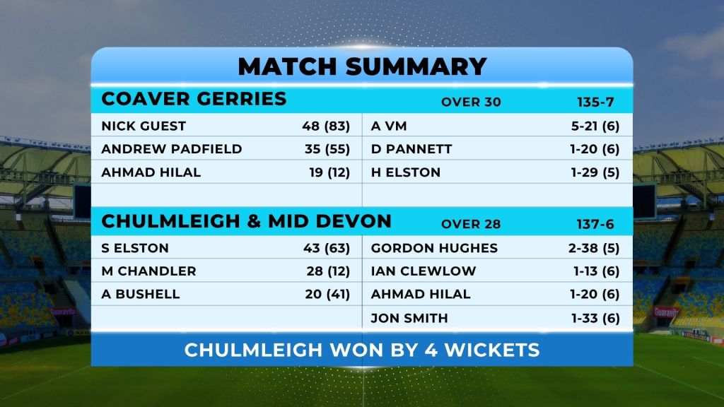 Chulmleigh’s next two betters managed to hold out as the afternoon light drew in, some big hitting got them over the line with only two overs to spare, a great effort and contribution from all.